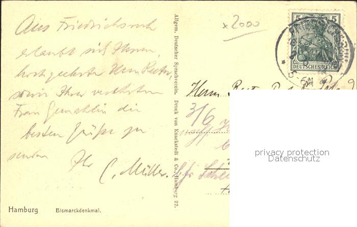 42158350 alte Postkarte HAMBURG CITY Bismarckdenkmal postalisch gelaufen Erhaltung siehe scans KatCode: 11110002000000