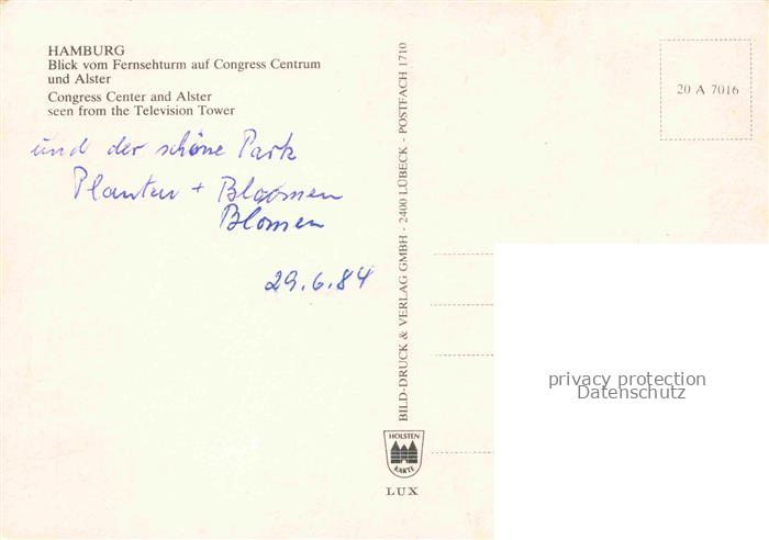 74042936 HAMBURG CITY Blick vom Fernsehturm auf Congress Centrum und Alster postalisch nicht gelaufen Erhaltung siehe scans [WerneD78] Wern Katcode 11110002000000