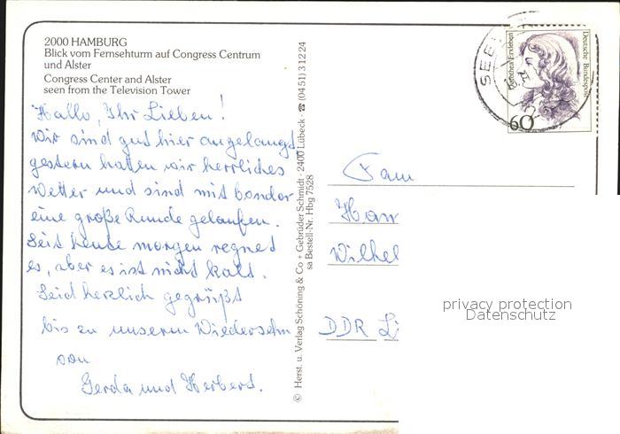 72534520 alte Postkarte HAMBURG CITY Blick vom Fernsehturm auf Congress Centrum und Alster postalisch gelaufen Erhaltung siehe scans [AndreD76 kt121box] KatCode: 11110002000000