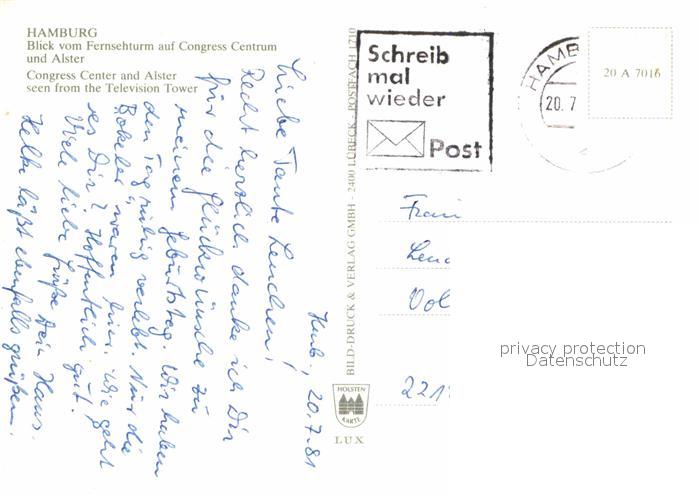 72688768 alte Postkarte HAMBURG CITY Blick vom Fernsehturm Congress Centrum Alster postalisch gelaufen Erhaltung siehe scans [FriedD77] KatCode: 11110002000000