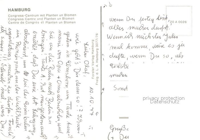 73756921 HAMBURG CITY Congress-Centrum m. Planten un Blomen postalisch nicht gelaufen Erhaltung siehe scans [LiesaD40] Lies Katcode 11110002000000