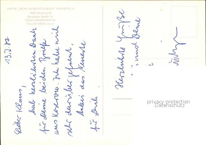 72614263 HAMBURG CITY Hotel Berlin Restaurant Kroefels postalisch nicht gelaufen Erhaltung siehe scans [LiesaD40] KatCode: 11110002000000