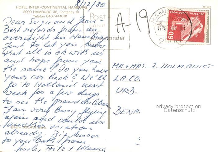 73738926 HAMBURG CITY Hotel Inter Continental postalisch gelaufen Erhaltung siehe scans [WerneD78] alte Postkarte Wern Katcode 11110002000000