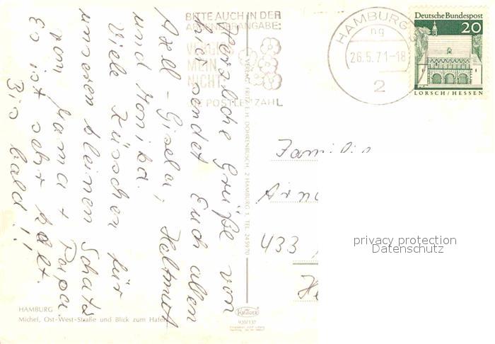 72844359 alte Postkarte HAMBURG CITY Michaeliskirche Michel Wahrzeichen Ost West Strasse Hafen Fliegeraufnahme postalisch gelaufen Erhaltung siehe scans [FriedD77] KatCode: 11110002000000