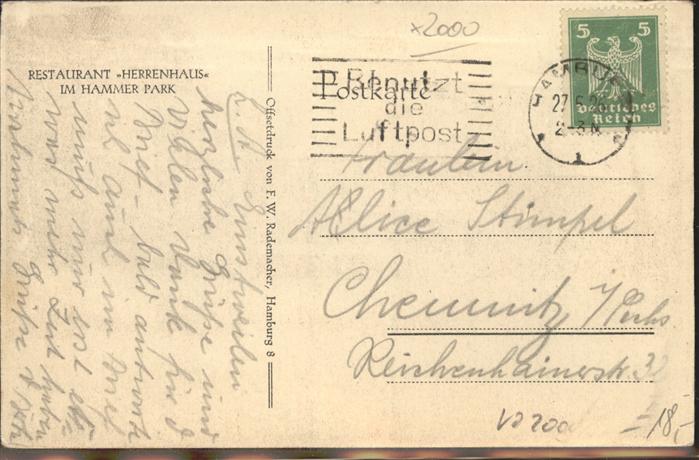 41057187 HAMBURG CITY Restaurant Herrenhaus Hammer-Park postalisch gelaufen Alte Ansichtskarte Postkarte alte Postkarte oeznu Katcode 11110002000000