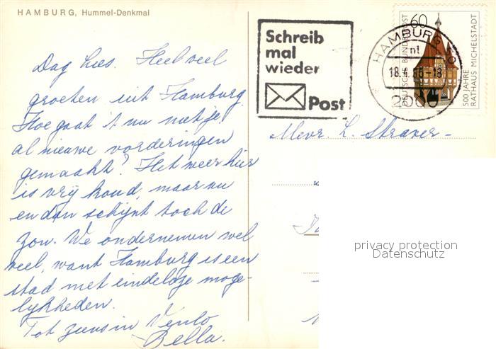 73306666 alte Postkarte Hamburg Hummel Denkmal postalisch gelaufen Erhaltung siehe scans [WerneD78] KatCode: 11110002000000