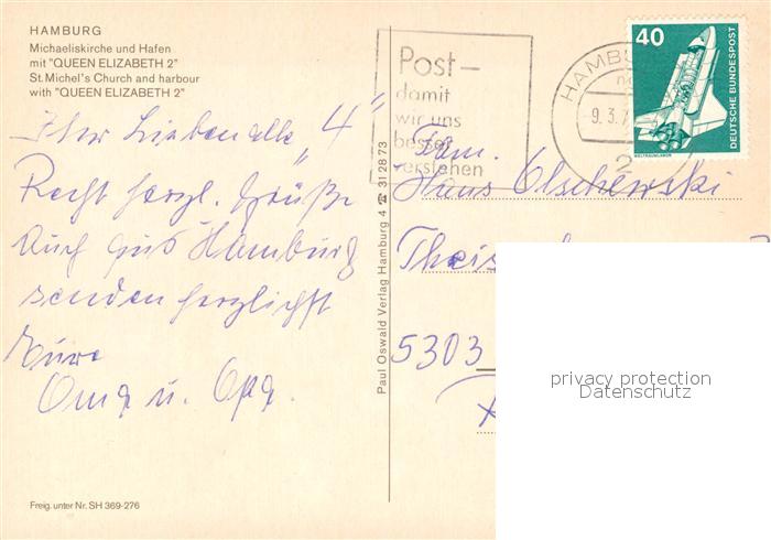 73321667 alte Postkarte Hamburg Michaeliskirche und Hafen mit Queen Elizabeth 2 Fliegeraufnahme postalisch gelaufen Erhaltung siehe scans [WerneD78] KatCode: 11110002000000