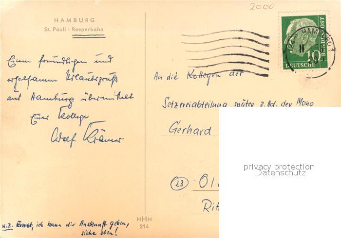 73137928 alte Postkarte Hamburg St. Pauli-Reeperbahn postalisch gelaufen Erhaltung siehe scans [NatalD47] KatCode: 11110002000000