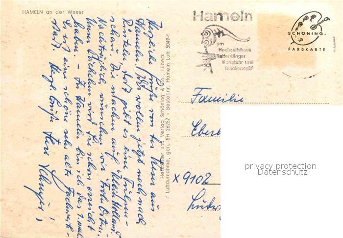 72907972 alte Postkarte Hameln Weser Fliegeraufnahme postalisch gelaufen Erhaltung siehe scans [FriedD77] KatCode: 11110003252006