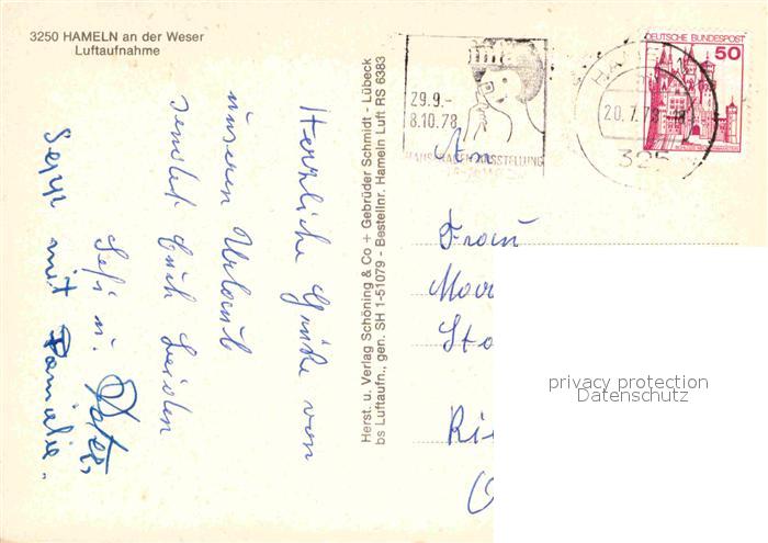 72837153 alte Postkarte Hameln Weser Fliegeraufnahme postalisch gelaufen Erhaltung siehe scans [FriedD77] KatCode: 11110003252006