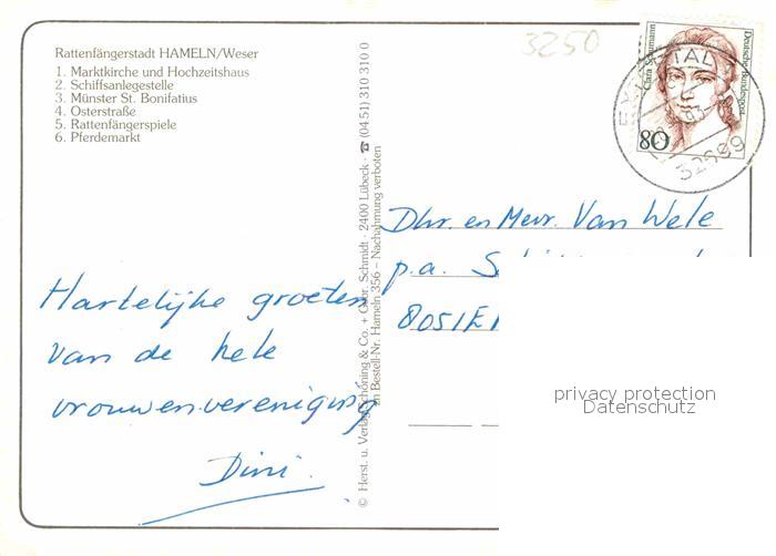 72887568 alte Postkarte Hameln Weser Marktkirche Schiffsanlegestelle Muenster St Bonifatius Osterstrasse Rattenfaengerspiele Pferdemarkt postalisch gelaufen Erhaltung siehe scans [WerneD78] KatCode: 11110003252006