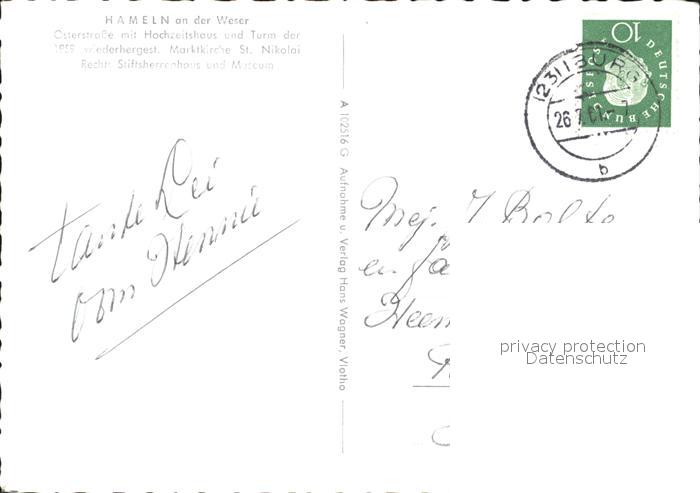 72030765 alte Postkarte Hameln Weser Osterstrasse mit Hochzeitshaus Turm der Marktkirche St Nikolai Stiftsherrenhaus Museum postalisch gelaufen Erhaltung siehe scans KatCode: 11110003252006