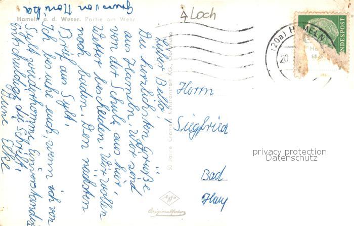 73069561 alte Postkarte Hameln Weser Partie am Wehr Bruecke Turm postalisch gelaufen Erhaltung siehe scans [FriedD77] KatCode: 11110003252006