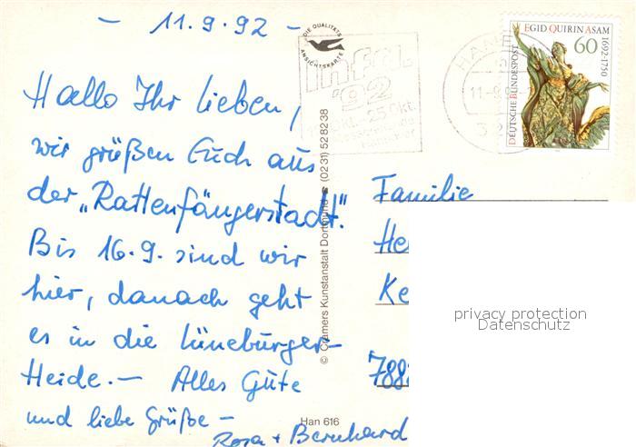73336644 alte Postkarte Hameln Weser Rattenfaenger Spiel Osterstrasse Baeckerstrasse Altstadt Museum Fussgaengerzone Pferdemarkt postalisch gelaufen Erhaltung siehe scans [WerneD78] KatCode: 11110003252006
