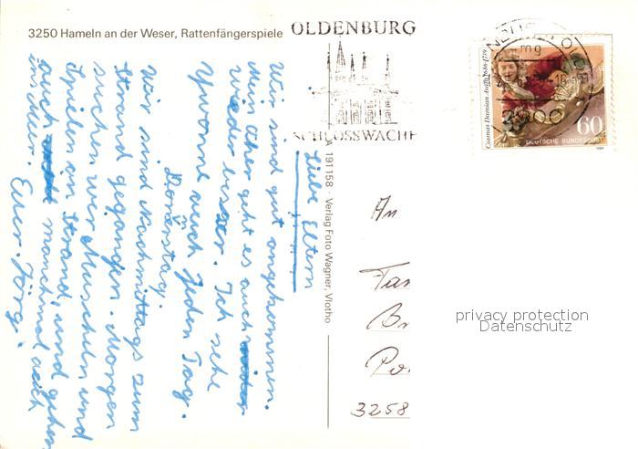 73021631 alte Postkarte Hameln Weser Rattenfaengerspiele postalisch gelaufen Erhaltung siehe scans [WerneD78] KatCode: 11110003252006