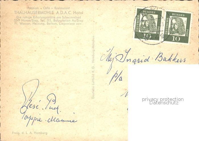 72430341 alte Postkarte Hamm Sieg Fliegeraufnahme Thalhausermuehle postalisch gelaufen Erhaltung siehe scans KatCode: 11110007132044