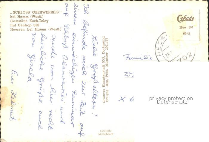 72032868 alte Postkarte Hamm Westfalen Schloss Oberwerries Gaststaette Koch Teloy Fliegeraufnahme postalisch gelaufen Erhaltung siehe scans KatCode: 11110005915000