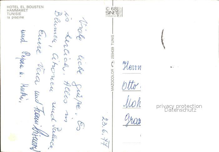alte Postkarte Hammamet Hotel El Bousten Schwimmbad postalisch gelaufen Erhaltung siehe scans