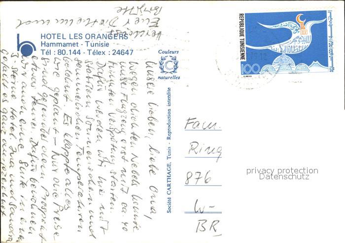 alte Postkarte Hammamet Hotel Les Orangers postalisch gelaufen Erhaltung siehe scans