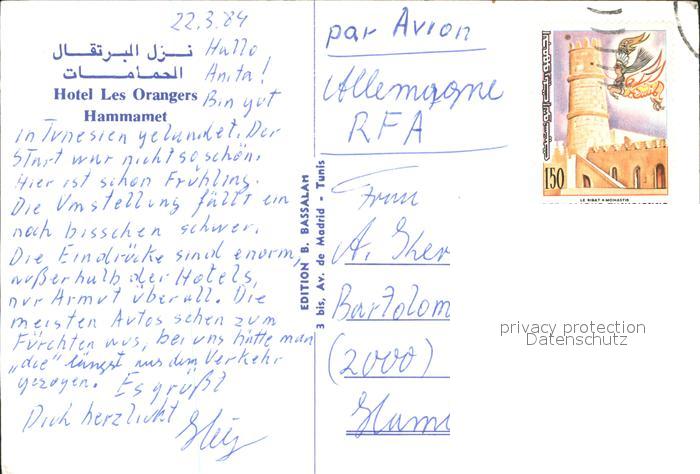 old postcard Hammamet Hotel Les Oranges postalisch gelaufen Erhaltung siehe scans