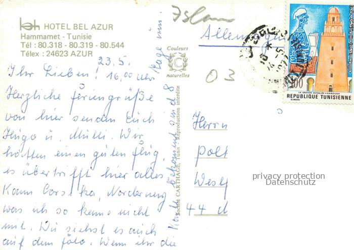 74092295 old postcard Hammamet Tunesie Hotel Bel Azur postalisch gelaufen Erhaltung siehe scans [IrynaD87] KatCode: 18520