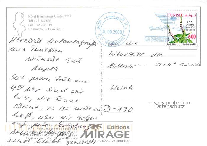 74092294 old postcard Hammamet Tunesie Hotel Garden postalisch gelaufen Erhaltung siehe scans [IrynaD87] KatCode: 18520