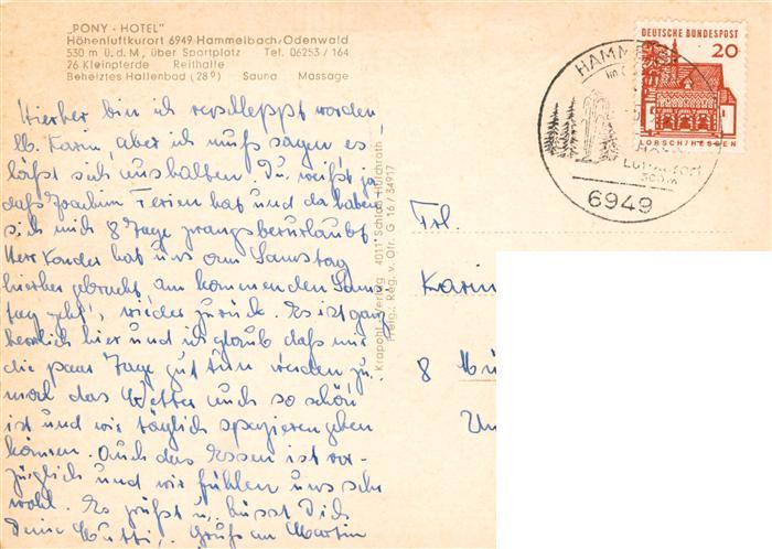 73898299 alte Postkarte Hammelbach Grasellenbach Pony Hotel Fliegeraufnahme postalisch gelaufen Erhaltung siehe scans [WerneD78] KatCode: 11110006431009