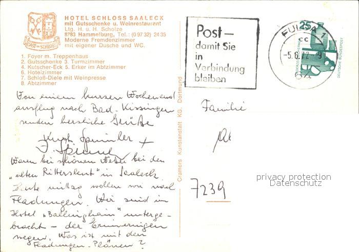 72421275 alte Postkarte Hammelburg Hotel Schloss Saaleck Restaurant Foyer Schenke Turmzimmer Erker Weinpresse Abtzimmer postalisch gelaufen Erhaltung siehe scans KatCode: 11110009672127