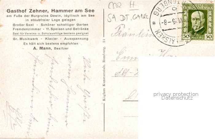 43253674 Hammer See Gasthof Zehner Burgruine Dewin Kuenstlerkarte postalisch gelaufen Erhaltung siehe scans [FriedD77] old postcard Frie Katcode 11520
