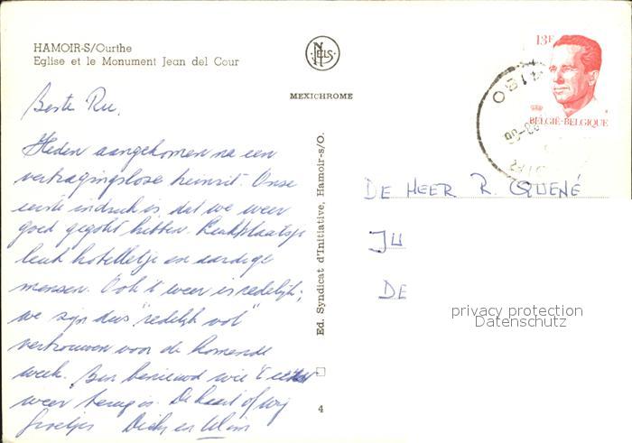 72435016 carte postale Hamoir Eglise Monument Jean del Cour postalisch gelaufen Erhaltung siehe scans KatCode: 11070061007917