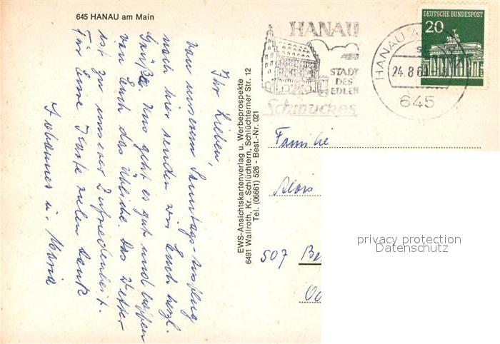72993798 alte Postkarte Hanau Main Fliegeraufnahme Schloss Kurpark Kirche Denkmal postalisch gelaufen Erhaltung siehe scans [AndreD76] KatCode: 11110006435014