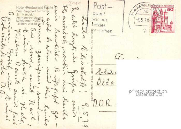 73713724 alte Postkarte Handeloh Hotel Restaurant Fuchs am Naturschutzpark Lueneburger Heide postalisch gelaufen Erhaltung siehe scans [FriedD77] KatCode: 11110003353015