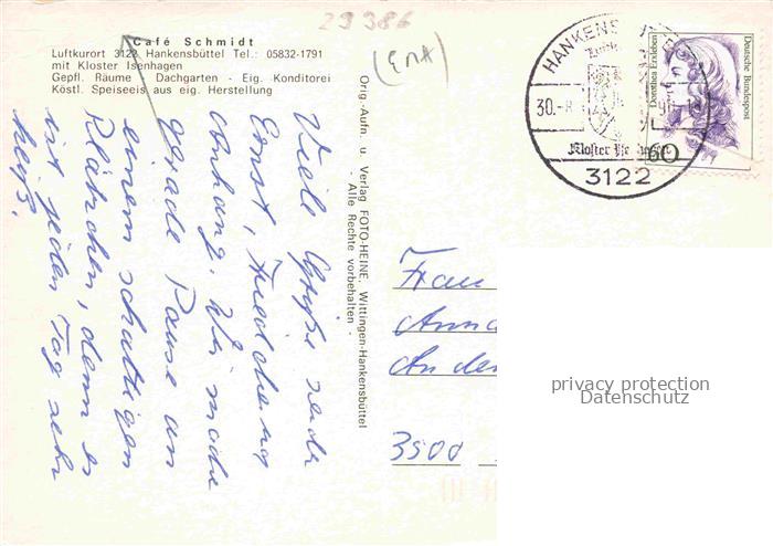 74090186 alte Postkarte Hankensbuettel Gifhorn Niedersachsen Lueneburger Heide Cafe Schmidt Gastraeume postalisch gelaufen Erhaltung siehe scans [WerneD78] KatCode: 11110003151011