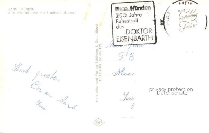 73141858 alte Postkarte Hann. Muenden Alte Werrabruecke mit Stadtteil Blume postalisch gelaufen Erhaltung siehe scans [FriedD77] KatCode: 11110003152016