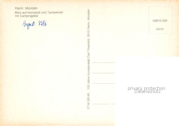 73868127 Hann. Muenden Blick auf Kernstadt und Tanzwerder mit Campingplatz Wappen postalisch nicht gelaufen Fliegeraufnahme Erhaltung siehe scans [FriedD77] KatCode: 11110003152016