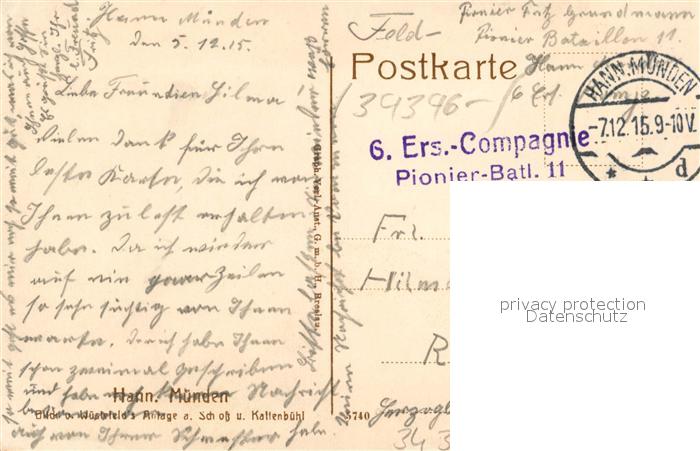 43184664 alte Postkarte Hann. Muenden Blick von Wuestefelds Anlage auf Schloss und Kattenbuehl postalisch gelaufen Feldpost Erhaltung siehe scans [FriedD77] KatCode: 11110003152016