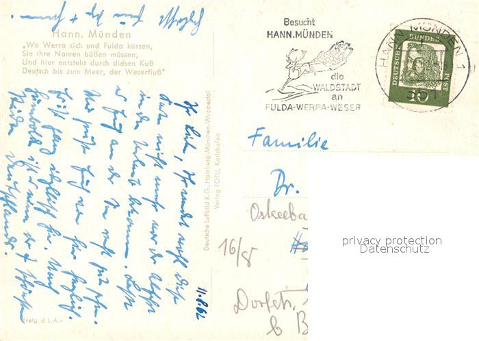 73129706 alte Postkarte Hann. Muenden Fliegeraufnahme postalisch gelaufen Erhaltung siehe scans [NatalD47] KatCode: 11110003152016