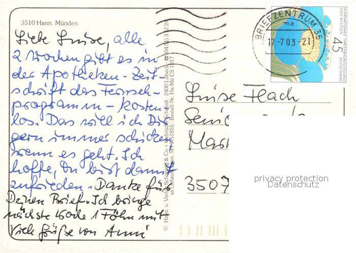 72882073 alte Postkarte Hann. Muenden Fliegeraufnahme postalisch gelaufen Erhaltung siehe scans [FriedD77] KatCode: 11110003152016