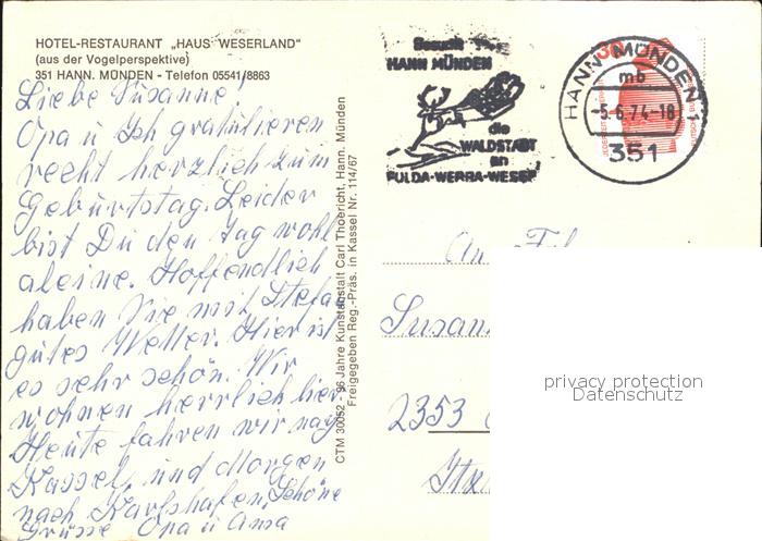 72535936 alte Postkarte Hann. Muenden Fliegeraufnahme Hotel Restaurant Haus Weserland postalisch gelaufen Erhaltung siehe scans [LiesaD40 kt120box] KatCode: 11110003152016