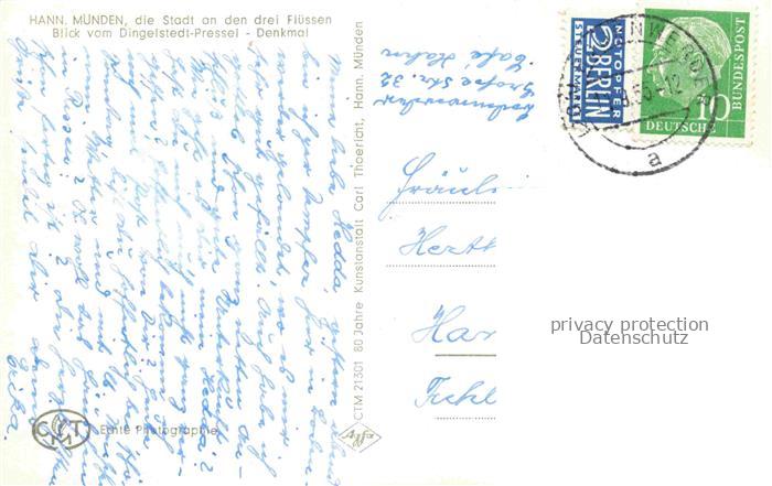 74042786 alte Postkarte Hann Muenden Hannoversch Muenden Goettingen Dreifluessestadt Blick vom Dingelstedt Pressel Denkmal postalisch gelaufen Erhaltung siehe scans [WerneD78] KatCode: 11110003152016