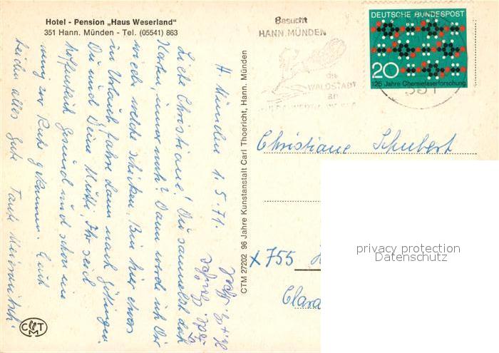 73174823 alte Postkarte Hann. Muenden Hotel Haus Weserland postalisch gelaufen Erhaltung siehe scans [NatalD47] KatCode: 11110003152016
