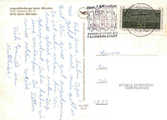 74085225 alte Postkarte Hann. Muenden Jugendherberge Altstadt Panorama Gondelteich postalisch gelaufen Erhaltung siehe scans [WerneD78] KatCode: 11110003152016