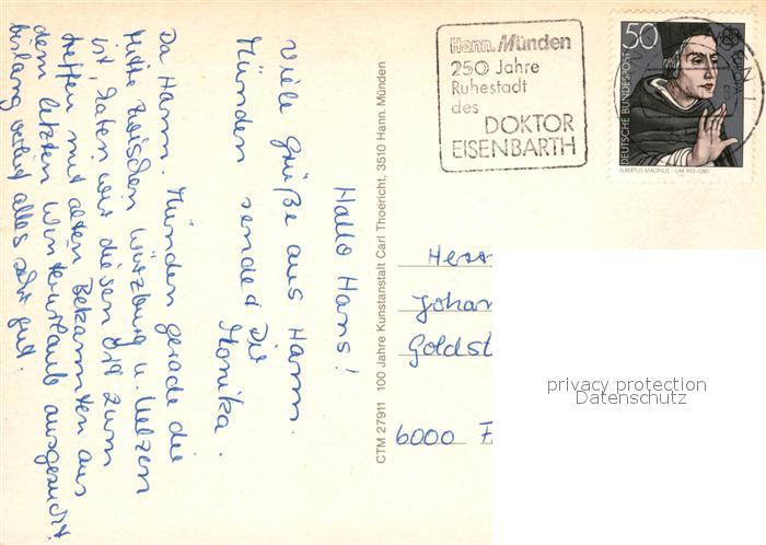 73082847 alte Postkarte Hann. Muenden Rathaus Marktplatz Bruecke Gedenkstein postalisch gelaufen Erhaltung siehe scans [FriedD77] KatCode: 11110003152016