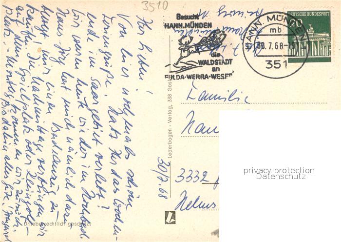 73692912 alte Postkarte Hann. Muenden Schloss Panorama Tillyschanze Zusammenfluss Kleingolfplatz postalisch gelaufen Erhaltung siehe scans [WerneD78] KatCode: 11110003152016