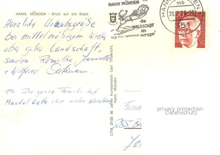 73648303 alte Postkarte Hann. Muenden Stadtblick postalisch gelaufen Erhaltung siehe scans [WerneD78] KatCode: 11110003152016