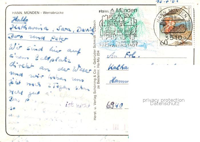 73070721 alte Postkarte Hann. Muenden Werrabruecke postalisch gelaufen Erhaltung siehe scans [FriedD77] KatCode: 11110003152016