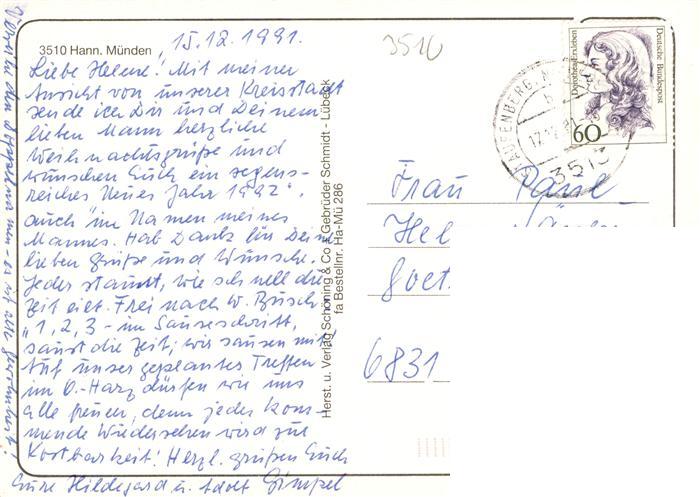 73936662 alte Postkarte Hann. Muenden Winterpanorama postalisch gelaufen Erhaltung siehe scans [WerneD78] KatCode: 11110003152016