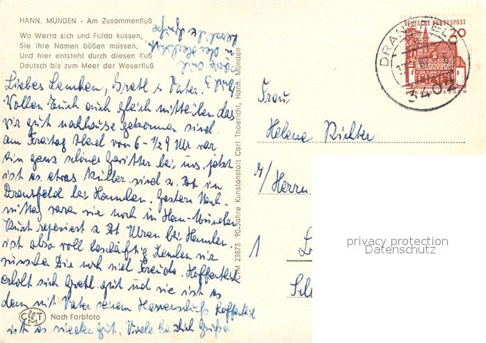 72930753 alte Postkarte Hann. Muenden Zusammenflusss von Werra und Fulda postalisch gelaufen Erhaltung siehe scans [LiesaD40] KatCode: 11110003152016