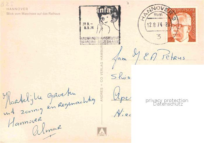 72862051 alte Postkarte HANNOVER CITY Blick vom Maschsee auf das Rathaus postalisch gelaufen Erhaltung siehe scans [WerneD78] KatCode: 11110003241001