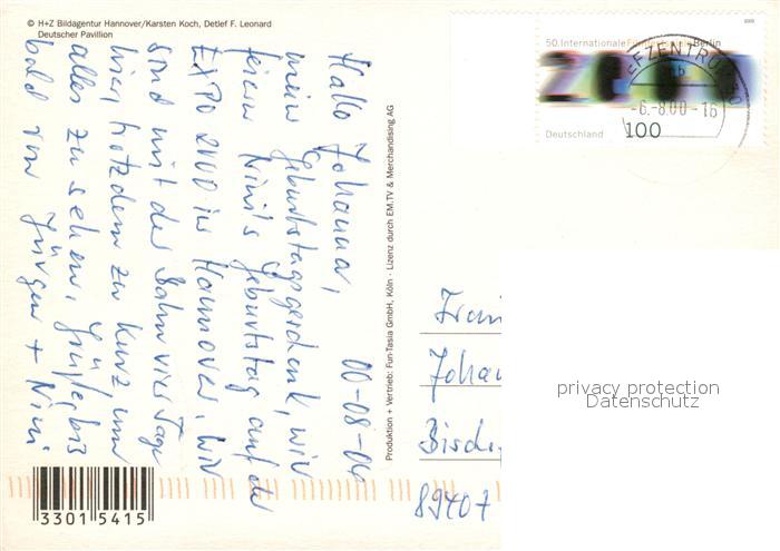 73129529 alte Postkarte HANNOVER CITY EXPO 2000 Deutscher Pavillion postalisch gelaufen Erhaltung siehe scans [PaolaD17] KatCode: 11110003241001